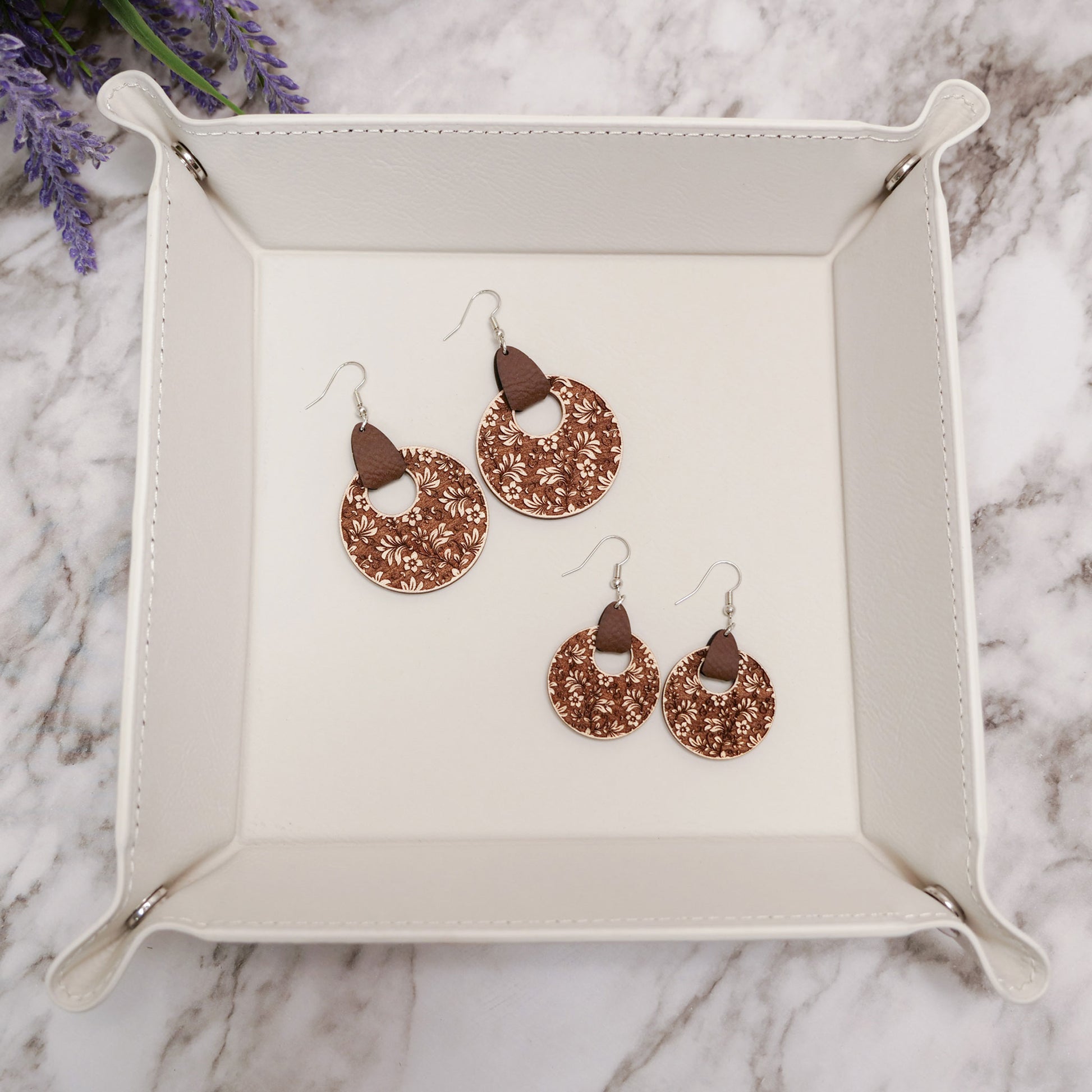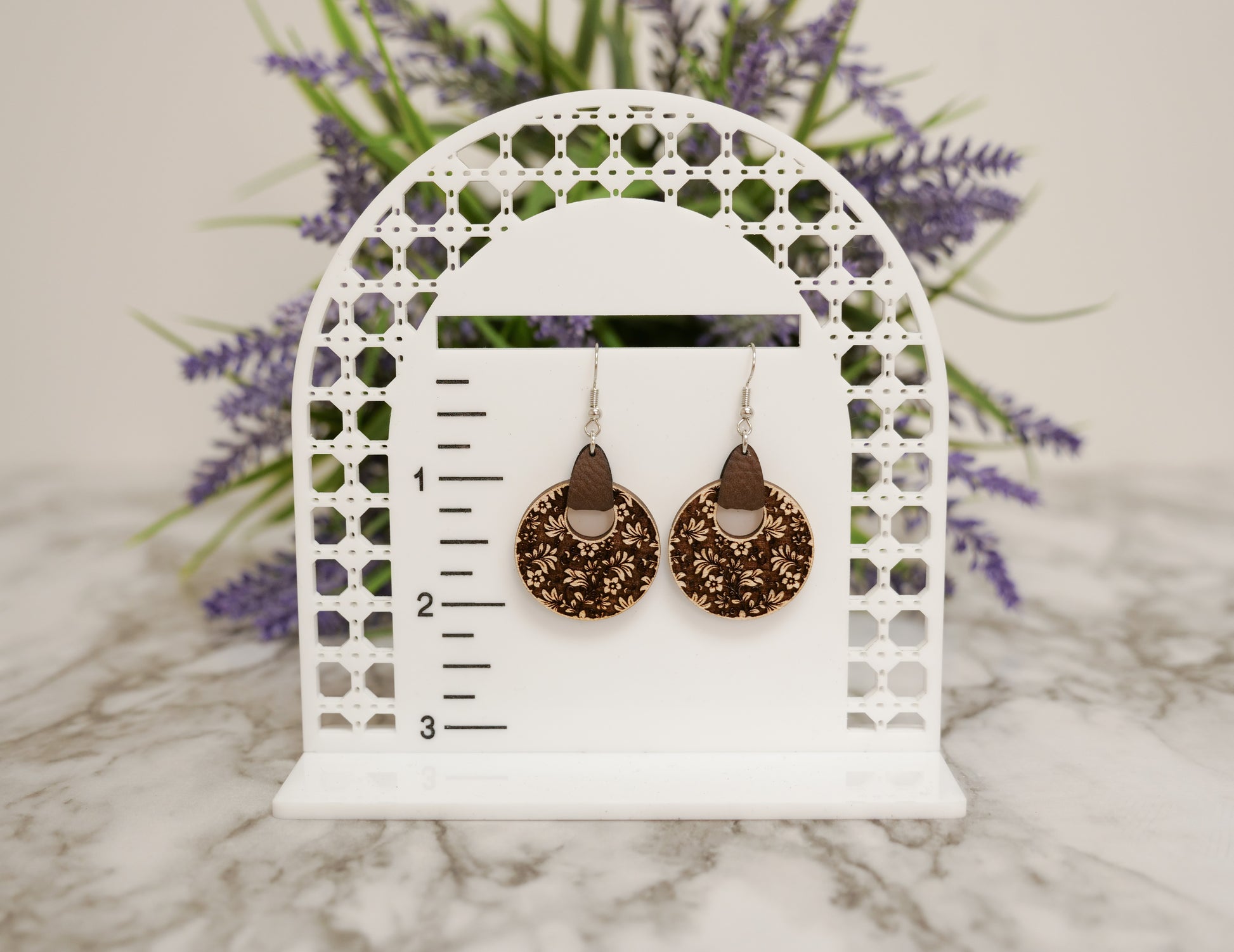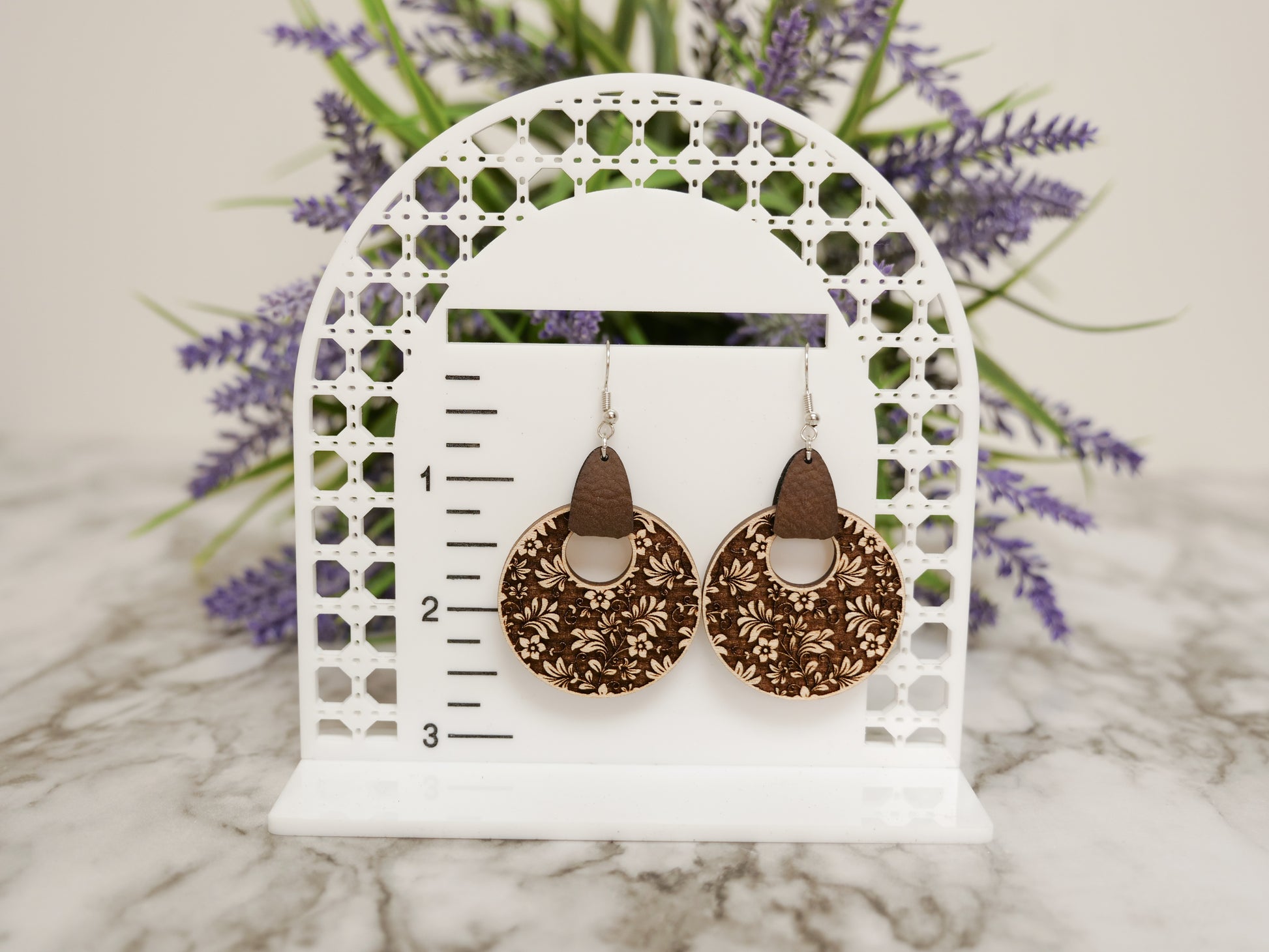 Add a fun and unique touch to your jewelry collection with these Circle Damask Wood & Leather Earrings. These earrings feature a beautiful circle damask design made of wood and leather, adding a touch of nature and texture to your look. Perfect for everyday wear or special occasions.