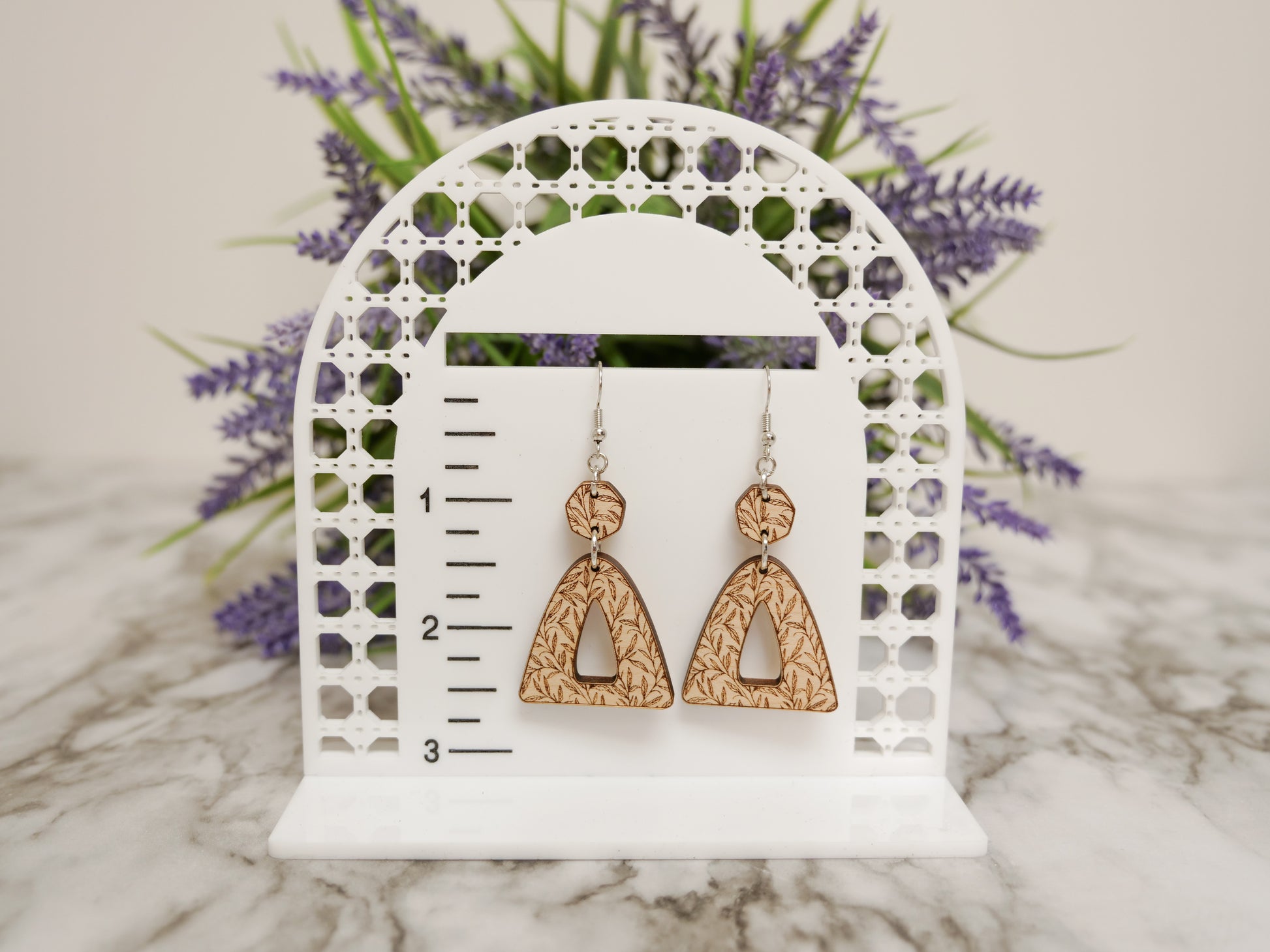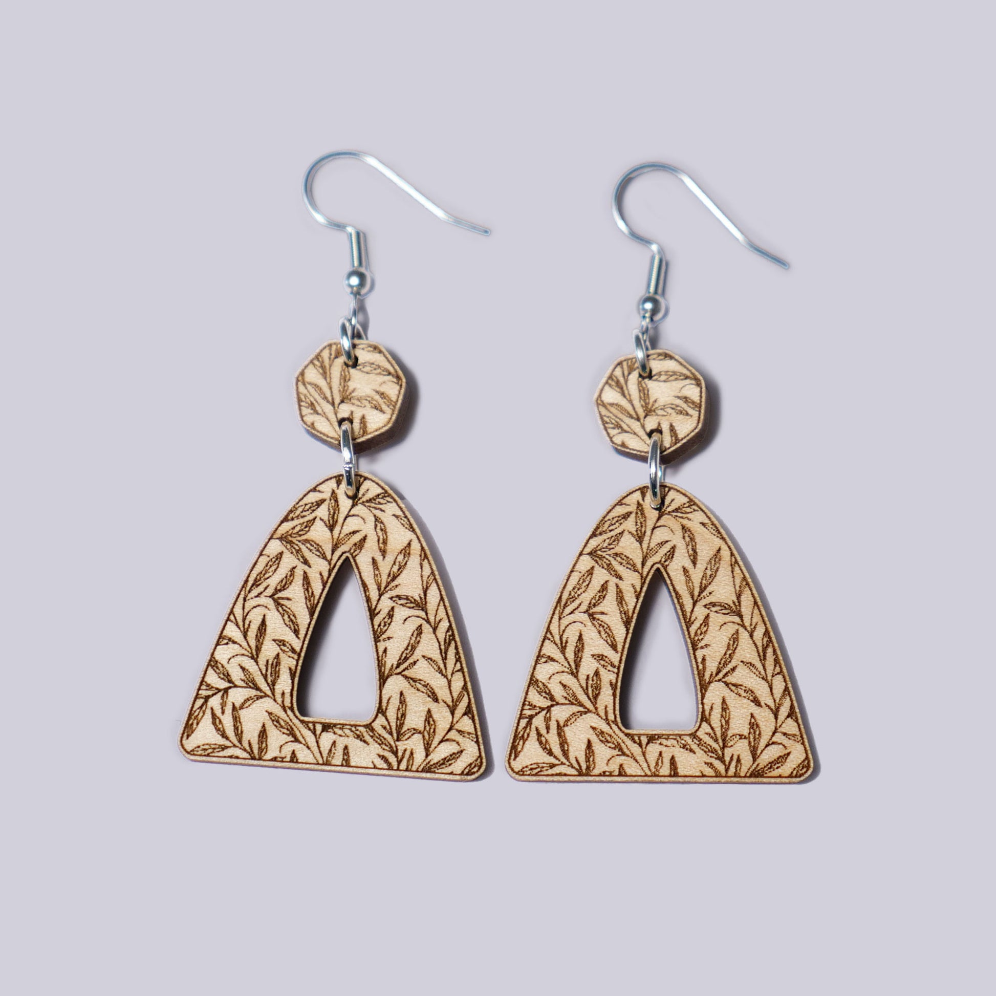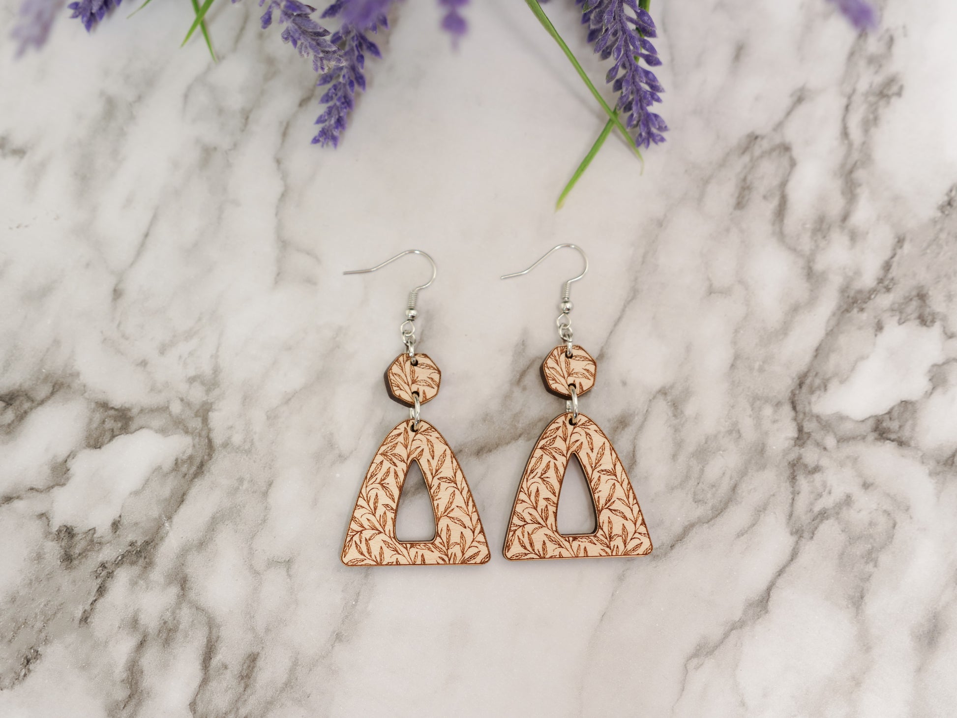 Add a touch of nature to your outfit with our Leaf Triangle Maple Wood Earrings. Crafted from high-quality maple wood, these earrings feature an engaved leaf design, making them the perfect accessory to elevate any look. Embrace the beauty of nature and show off your style with these earrings.